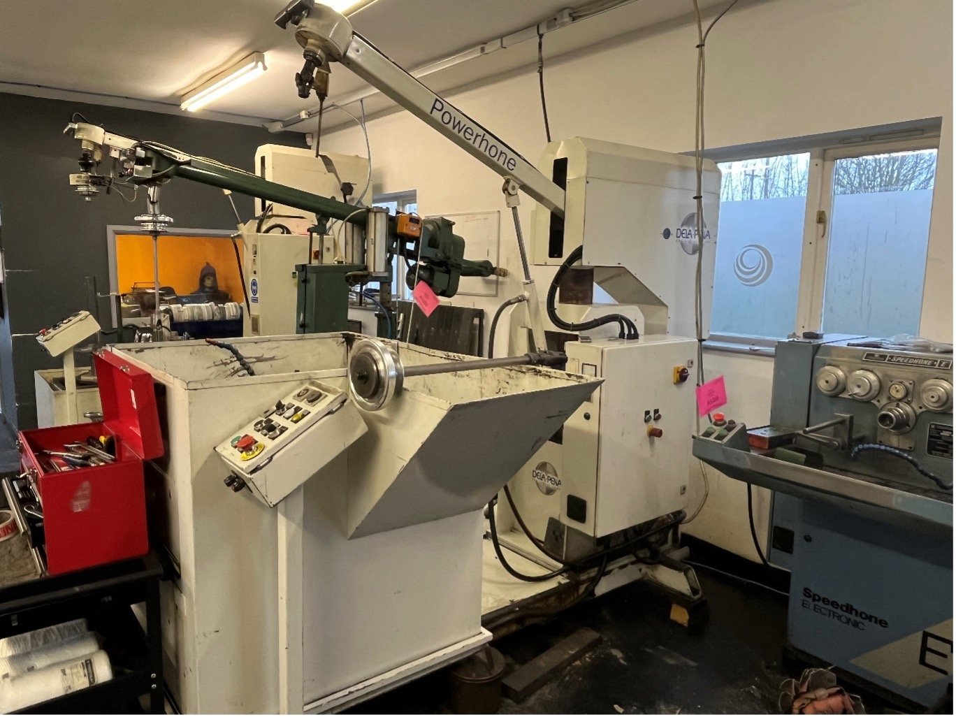 Description:- The Powerhone replaced the Autostroker in Delapena’s range back in the mid noughties. This version dates from (we believe) 2008 and it retains the Autostroker’s semi-automatic friction feed unit. It has improved hydraulic expansion retaining both short stroke and dwell facilities along with a built in coolant tank & pump unit.